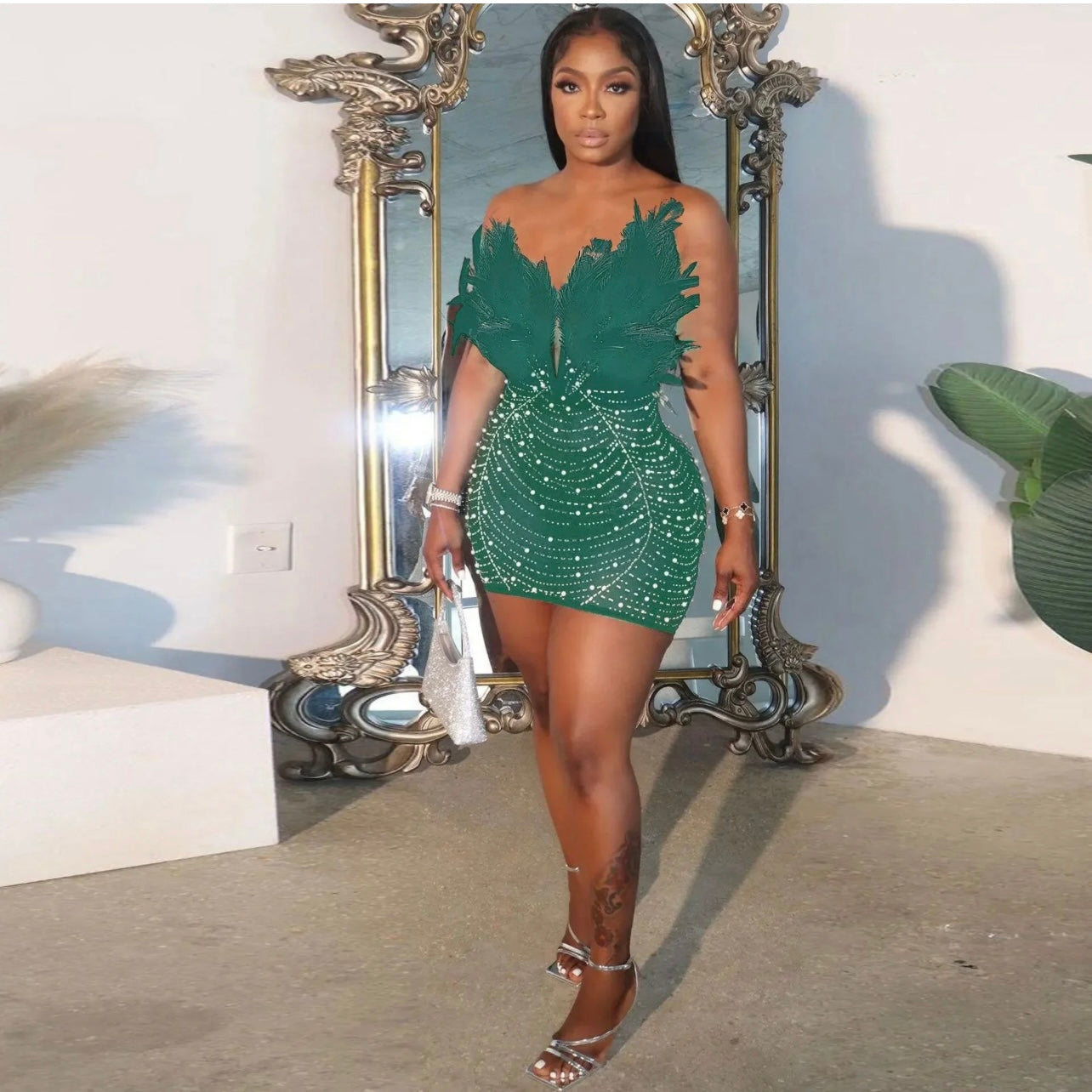 Dazzle the room with Amber - the elegant feather top dress. With a plunging v-neck and a strapless design, this dress will turn heads. Featuring a feather adorned chest, it's the perfect statement piece for any special occasion. Let your inner diva shine with Amber.