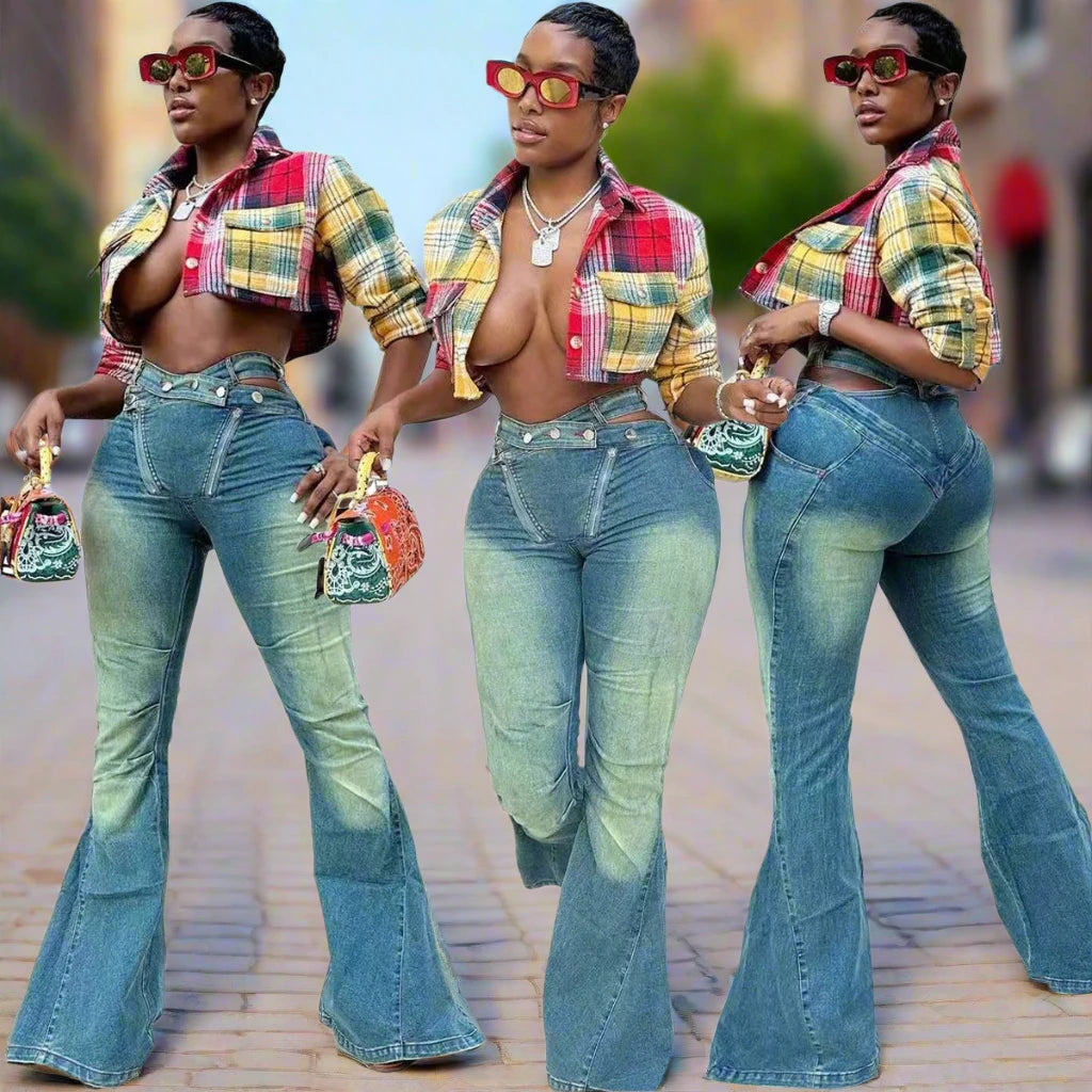 Get ready to show off your flair with Cassandra - Flair Leg Jeans. These jeans feature a playful flare leg design that will add a touch of fun and style to any outfit. Perfect for those who love to stand out and make a statement. Don't be afraid to flaunt your fashion sense with Cassandra!