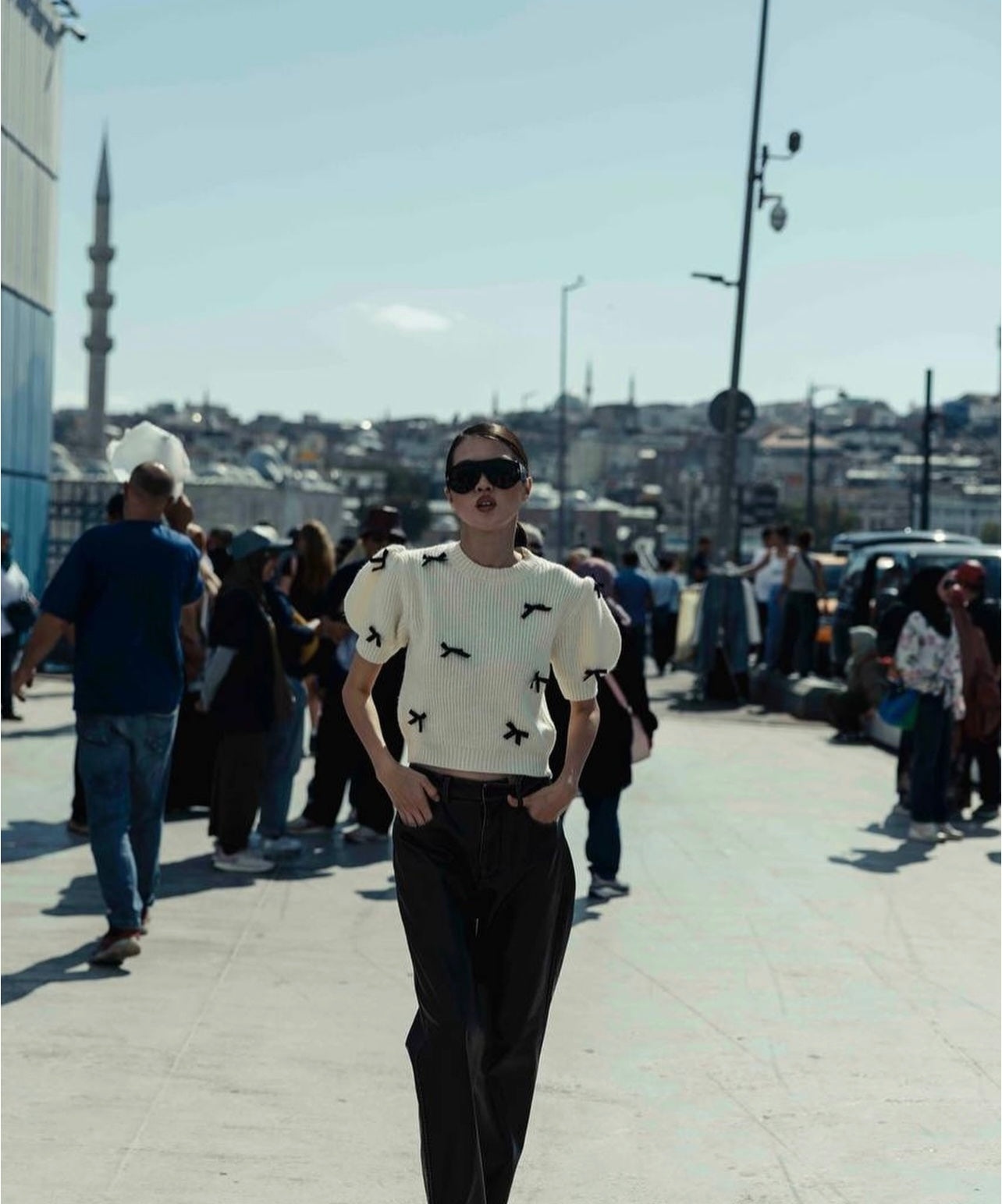 Add a touch of whimsy to your sweater game with the Keri - Sweater. This playful sweater features a small black bow adornment, making it the perfect statement piece for any outfit. Stay cozy and stylish all winter long with this quirky addition to your wardrobe!