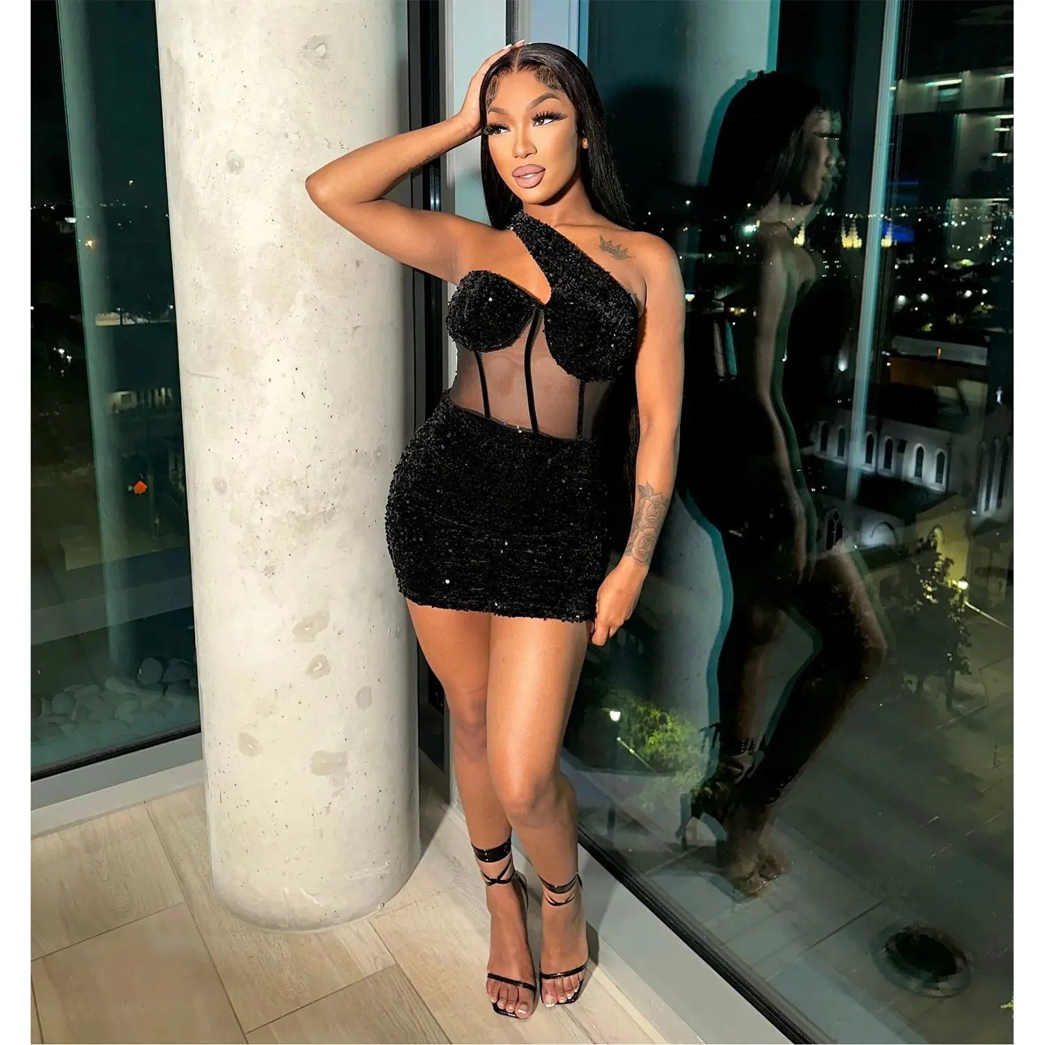 Introducing Krystal, the ultimate party dress! With its one shoulder design and dazzling sequins, this mini dress is sure to turn heads. Get ready to shine all night long in this must-have piece.