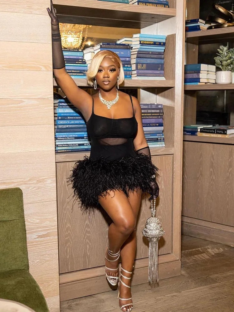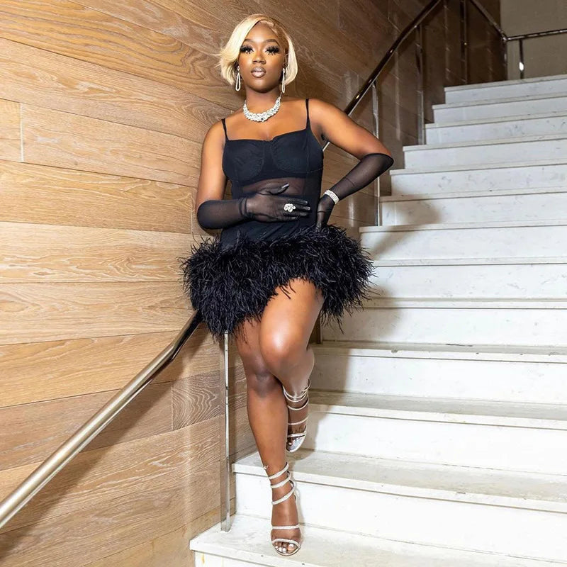 Get ready to turn heads in our Monica dress! This short, sassy and sexy number is a combination of sheer and feathers, creating the perfect mix of flirty and fierce. Be the life of the party in this unique and statement-making dress.